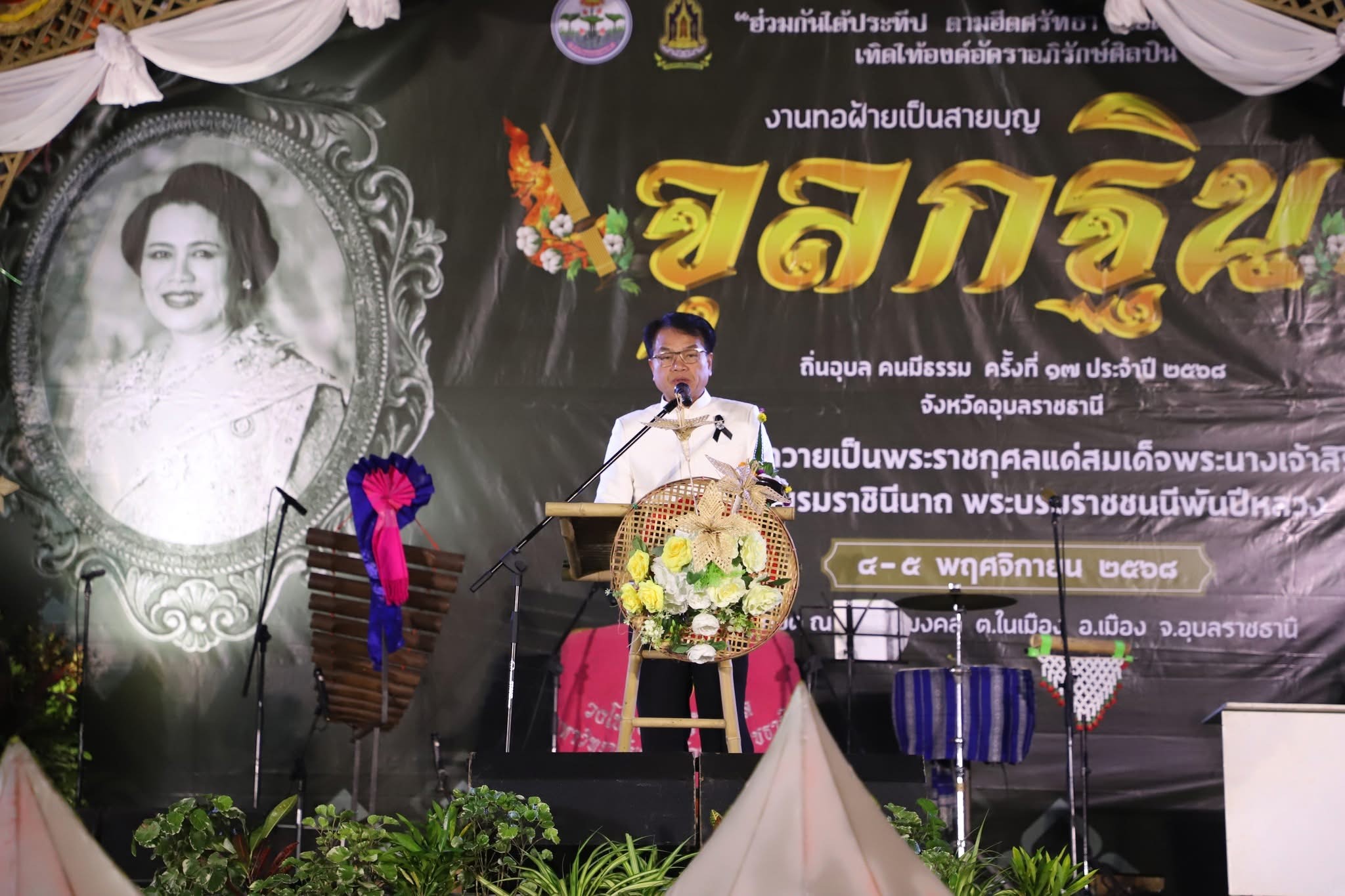 วันนี้ (4 พฤศจิกายน 2568) เวลา 18.00 น. นายชำนาญ ชื่นตา ผู้ว่าราชการจังหวัดอุบลราชธานี เป็นประธานเปิดกิจกรรม ฉลองสมโภชองค์กฐิน ชมการแสดงศิลปะและวัฒนธรรม และกิจกรรม “ฮ่วมกันกินข้าวแลง” ณ อาคารโดมโรงเรียนพุทธเมตตาวิทยา วัดไชยมงคล อำเภอเมืองอุบลราชธานี โดยมีนางมัณฑนา ชื่นตา นายกเหล่ากาชาดจังหวัดอุบลราชธานี หัวหน้าส่วนราชการ และประชาชนชาวจังหวัดอุบลราชธานี เข้าร่วมกิจกรรมอย่างคับคั่ง ในพิธี นายชำนาญ ชื่นตา ผู้ว่าราชการจังหวัดอุบลราชธานี ได้มอบเกียรติบัตรให้แก่บุคคล องค์กร และหน่วยงานที่ให้การสนับสนุนการจัดงาน เพื่อเชิดชูเกียรติและสร้างขวัญกำลังใจแก่ผู้ร่วมขับเคลื่อนงานบุญของจังหวัด